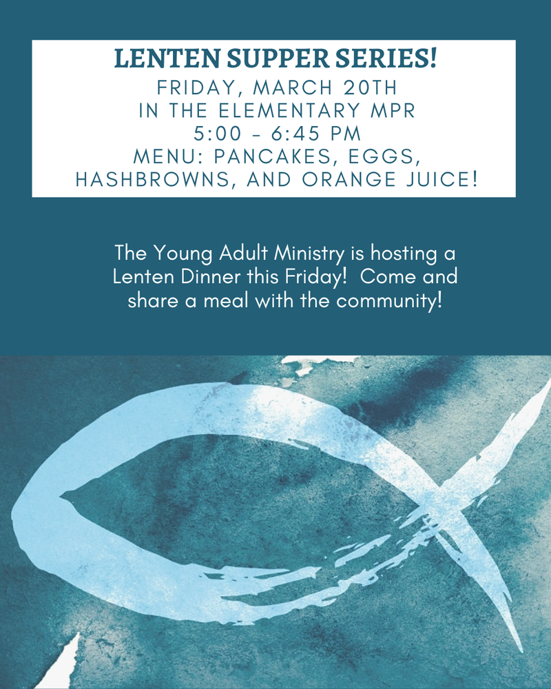 Join us for our Lenten Dinner hosted by the Young adult Ministry in the Elementary MPR for pancakes, eggs, hashbrowns, and orange juice. Stations of the Cross in the Church to follow!