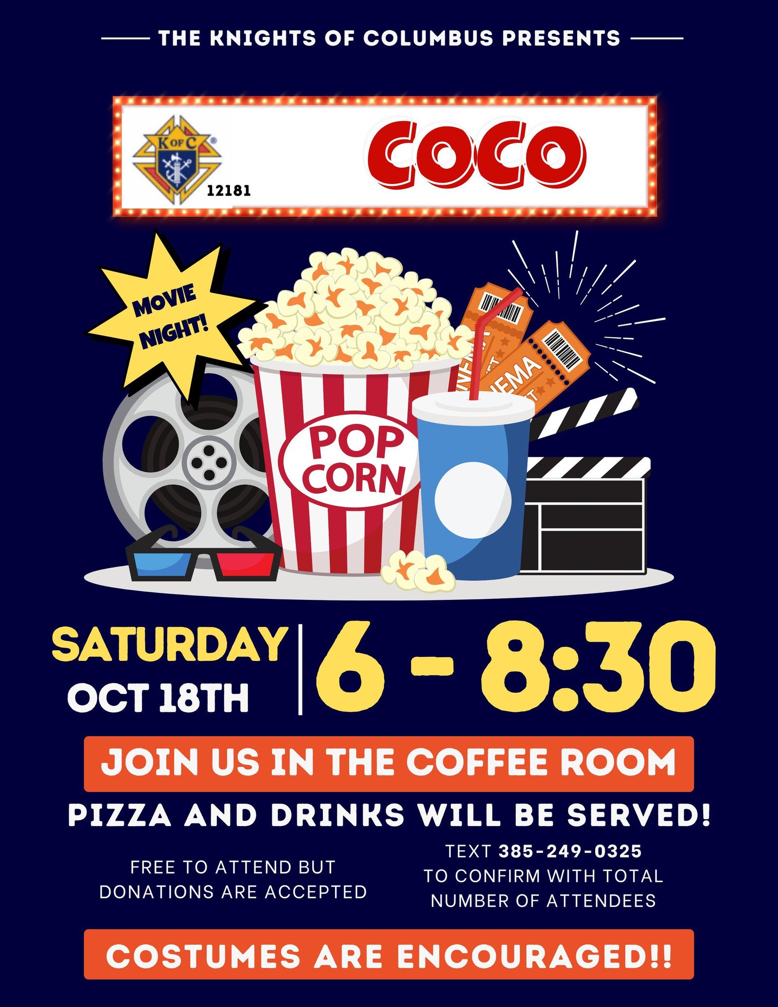 The Knights of Columbus Council #12181 will host a FREE family movie night on Saturday, October 18th after the 5pm Mass in the Coffee Room. Join our Knights for a screening of Coco! Pizza and drinks will be served. Donations will be accepted. Costumes encouraged.
