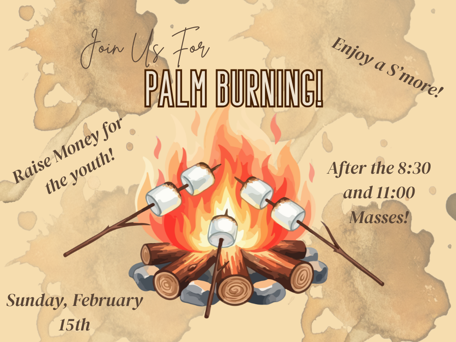 Join us February 15th for our annual Palm Burning! Last year's blessed palms will be burned to create the ashes used on Ash Wednesday. Coffee, hot chocolate, s'mores and cupcakes will be served. We look forward to celebrating together as we prepare for Lent!