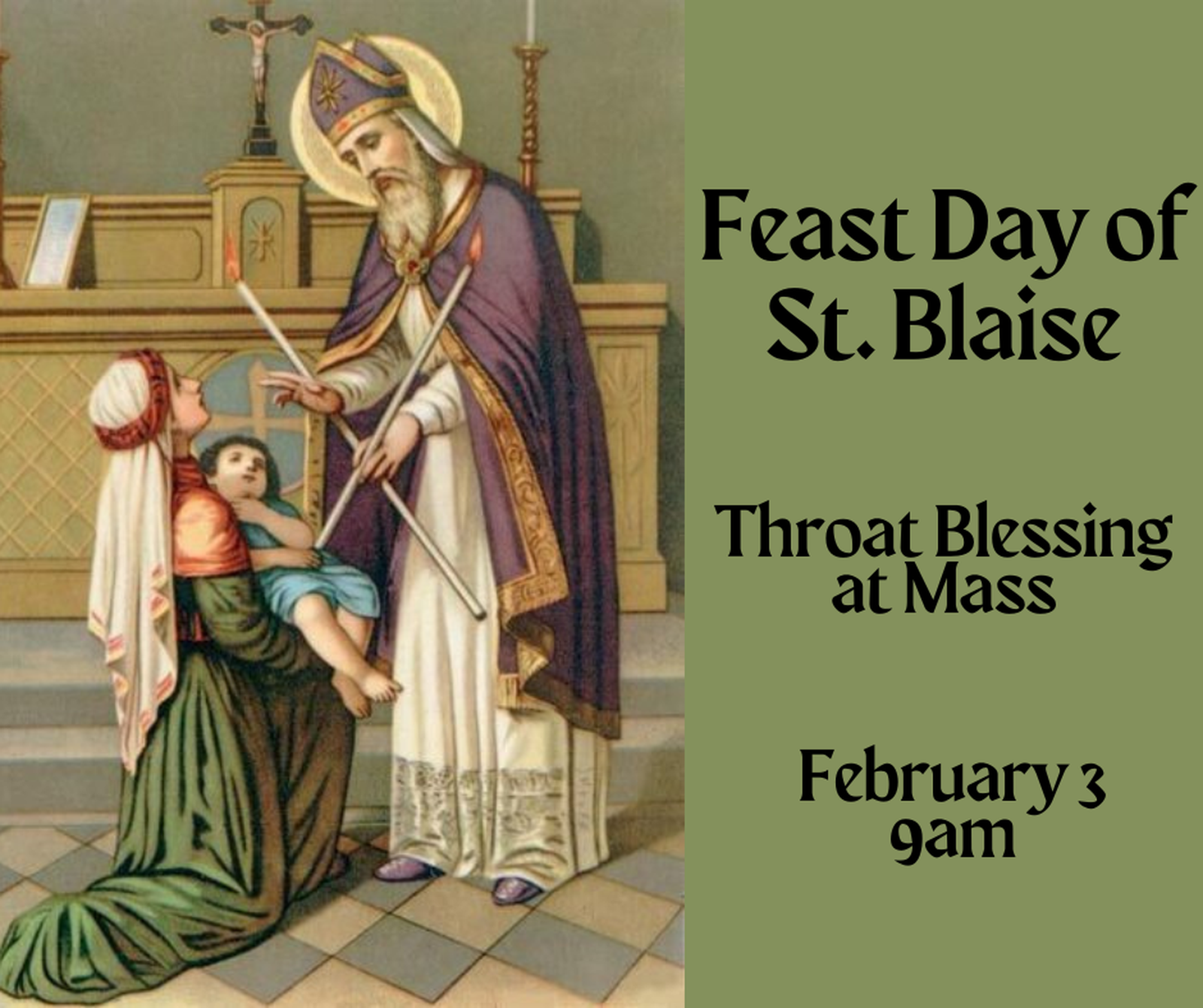 Please join us for Mass on the feast day of St. Blaise, Bishop and Martyr, where parishioners can have their throats blessed. The aid of St. Blaise is asked in delivering the faithful from throat ailments and other illnesses.