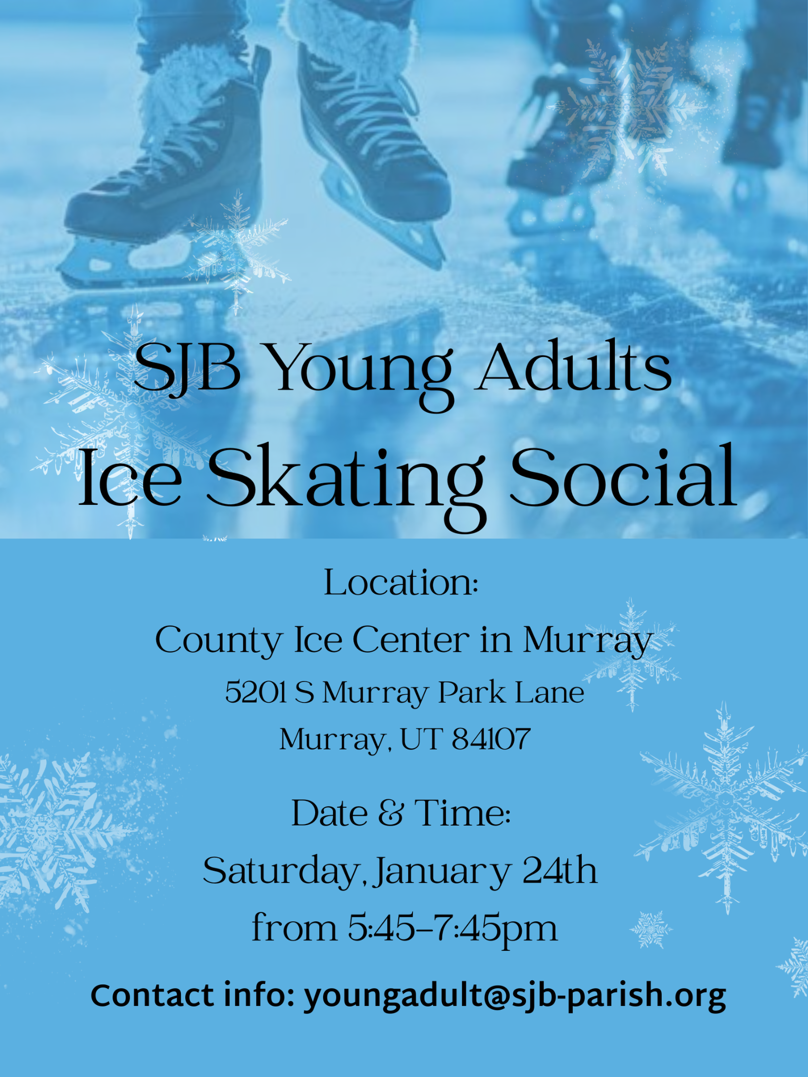 Join the SJB Young Adults for ice skating at the County Ice Center in Murray! Questions? Contact [email protected]