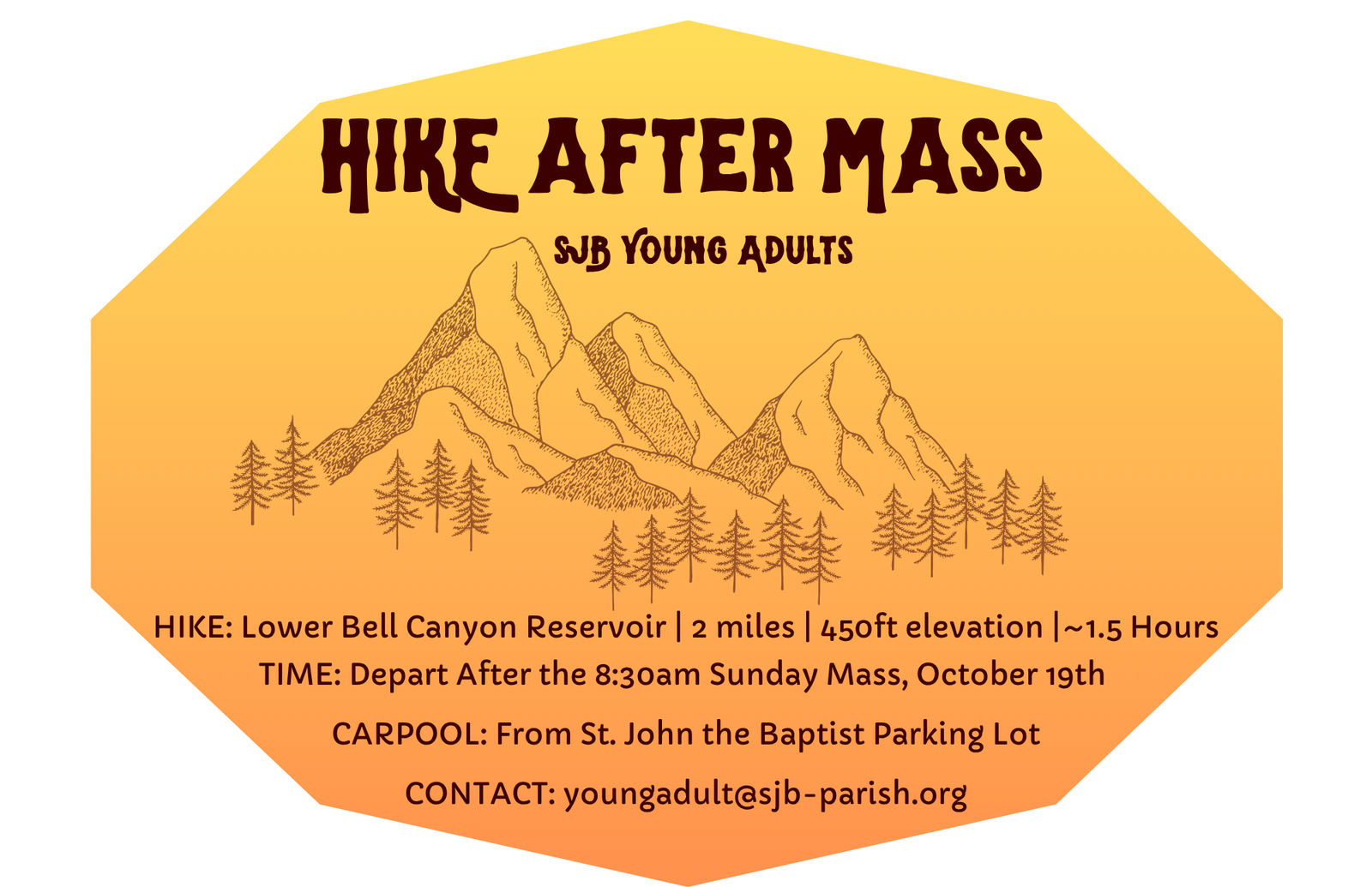 Join the SJB Young Adults for a 2 mile hike at Lower Bell Canyon Reservoir. We'll carpool from the parish parking lot after Mass. Questions? Contact [email protected]