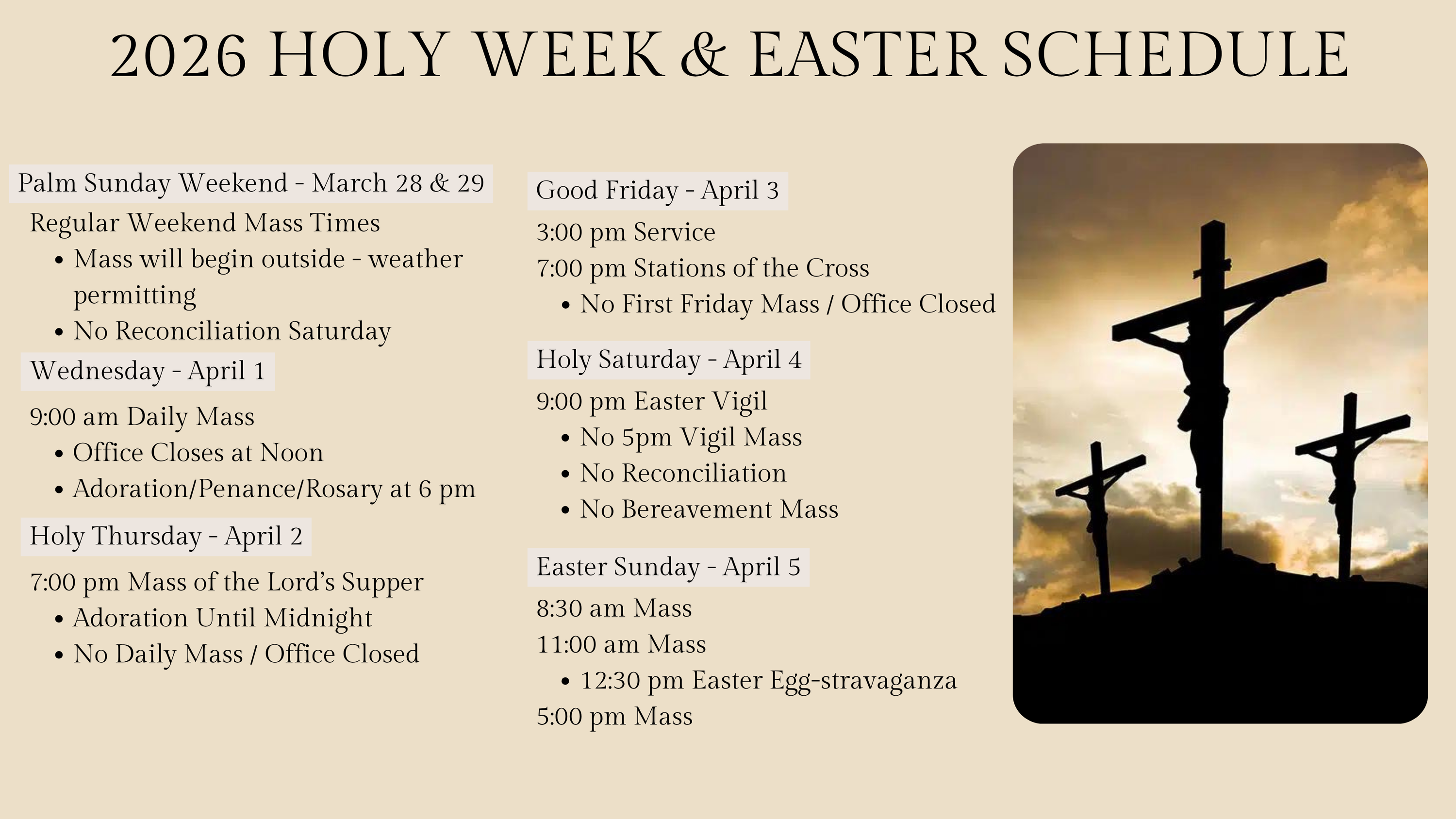 No collection is taken up during Mass. But if you'd like to make a gift, there is a tithe baskets right in the Gathering Space near the exits. *Or click here to make your gift online (all parishioners are encouraged to set up an automatic, recurring gift).*
